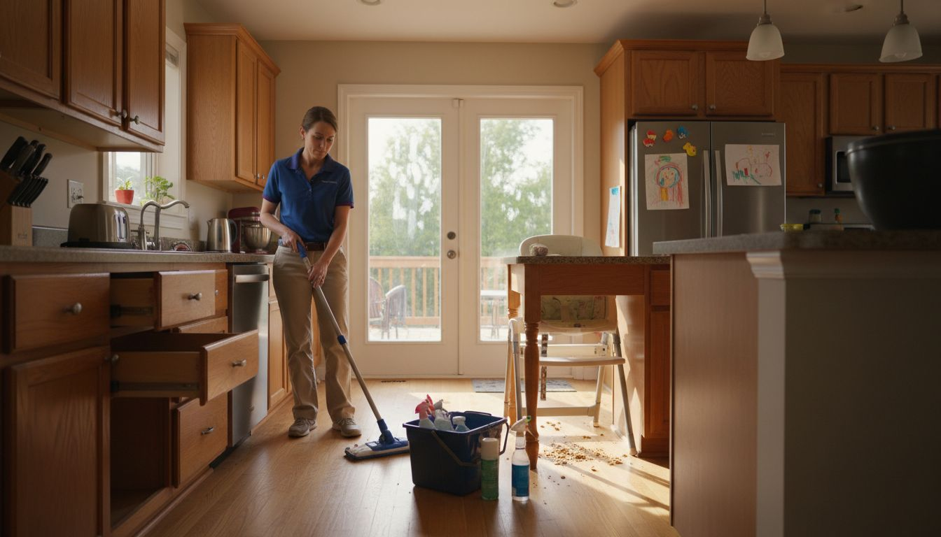 - Kitchen: inside appliances, cabinet exteriors, sink and faucet deep clean, backsplash scrubbing, floor mopping with grout attention